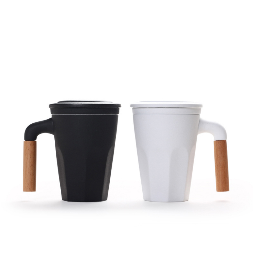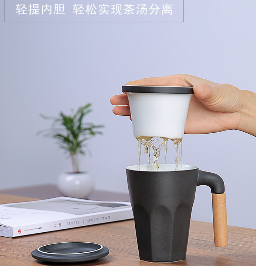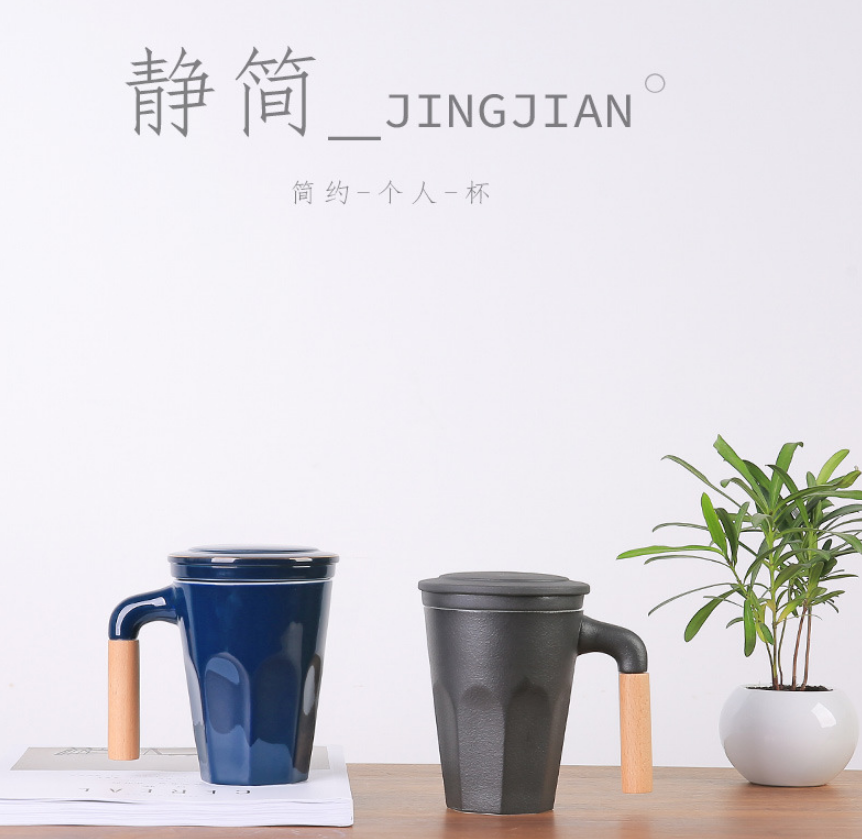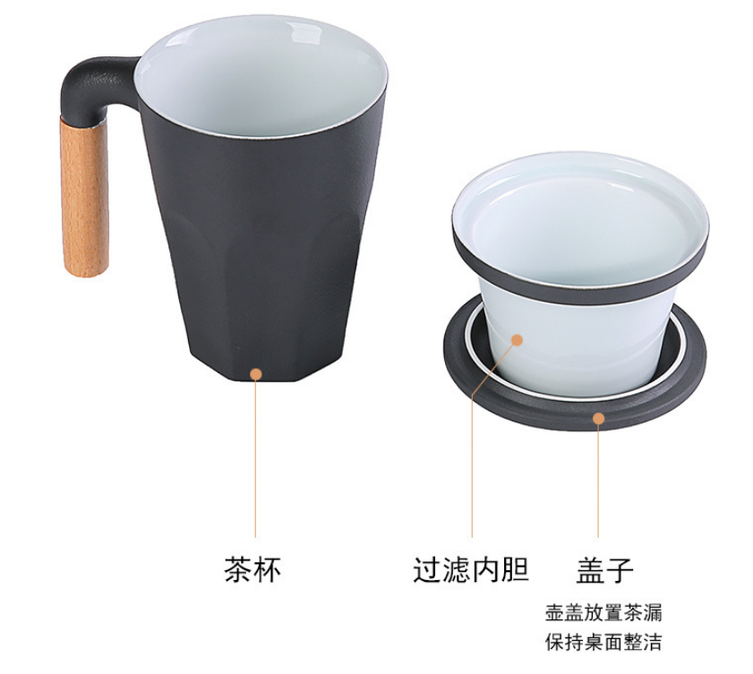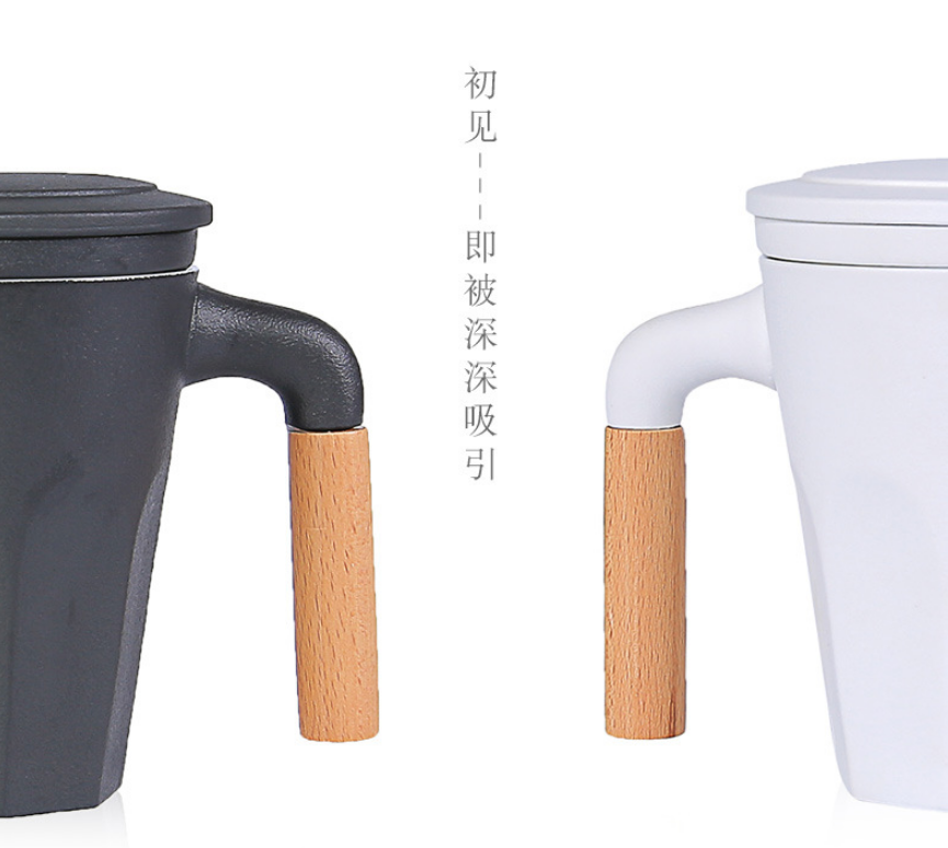 木柄泡茶杯帶蓋過濾茶杯 陶瓷馬克杯LOGO定制 商務(wù)禮品