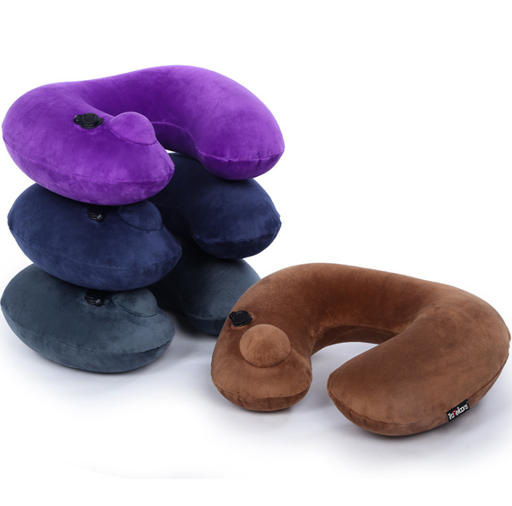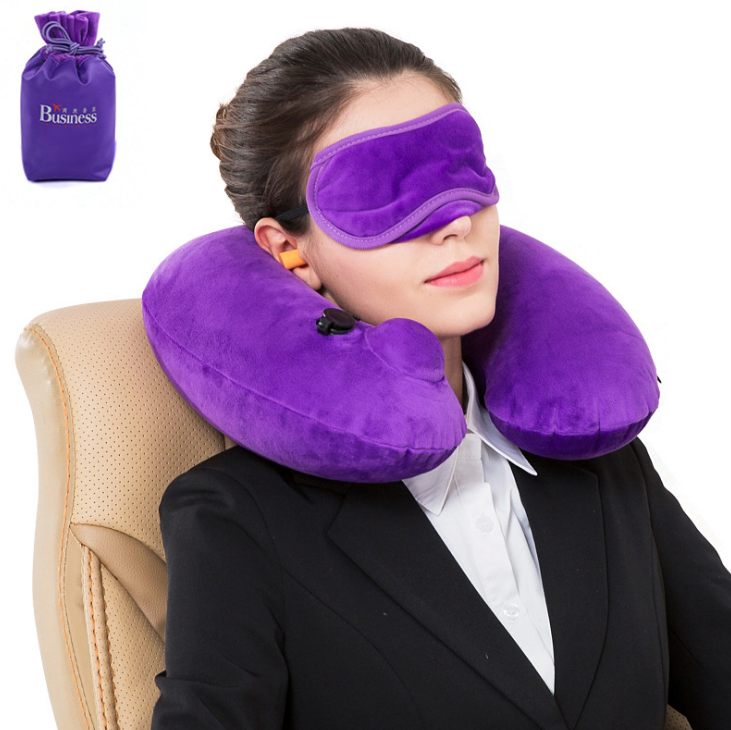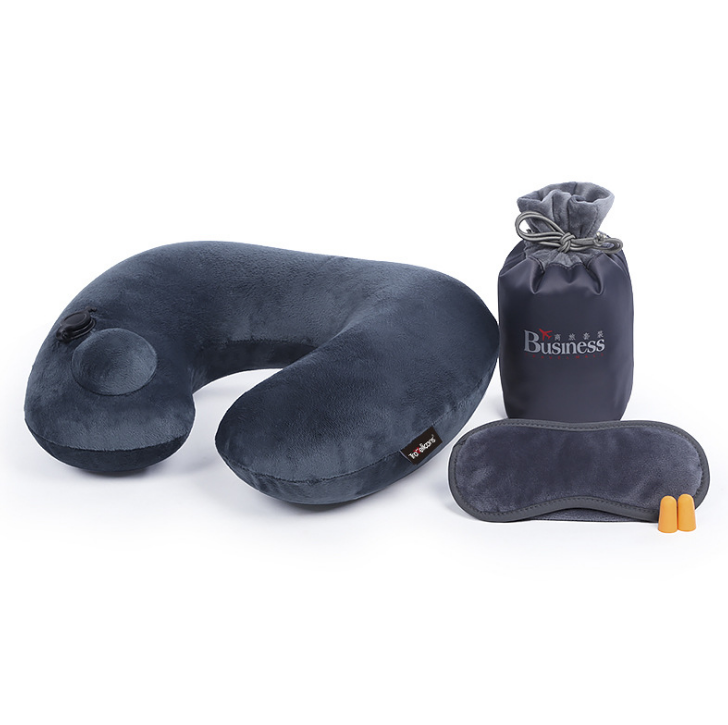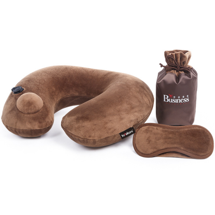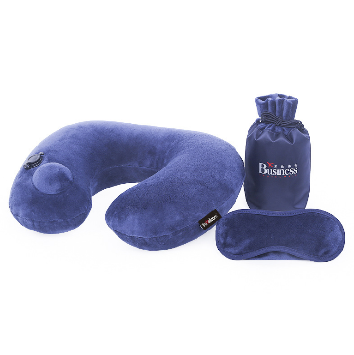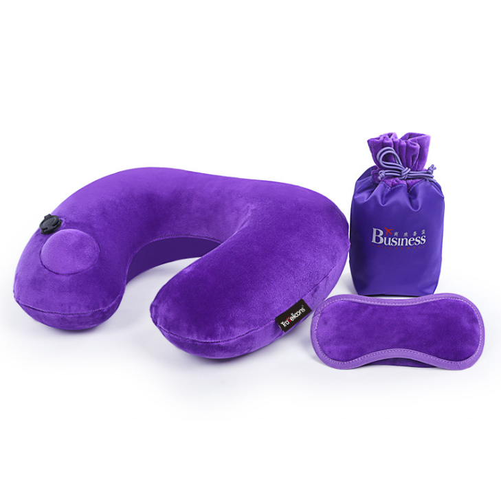 按壓自動充氣U型枕水晶絨充氣護頸三件套收納袋 廣告展會禮品